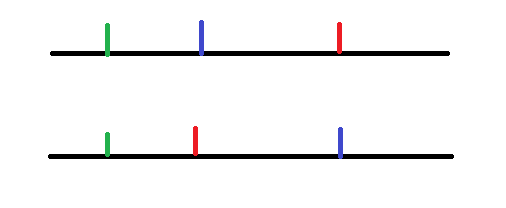 - Case 2의 경우 모든 초록색 / 파란색 강아지 각각에 대해 가장 $a_i$가 가까운 빨간색 강아지까지의 $a_i$의 차이를 구한 뒤, 이 둘을 더하면 됩니다. 이 두 강아지가 겹치는 경우에는 어떻게 하냐고 생각하실 수 있는데, 이 경우 아래와 같은 두 가지 경우가 있습니다. 둘 모두 초록색 강아지와 파란색 강아지를 직접 이어주는 더 작거나 같은 해가 존재하기 때문에 상관없습니다.
