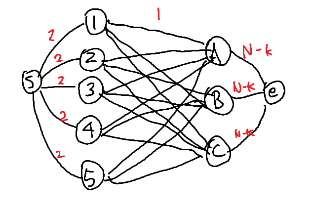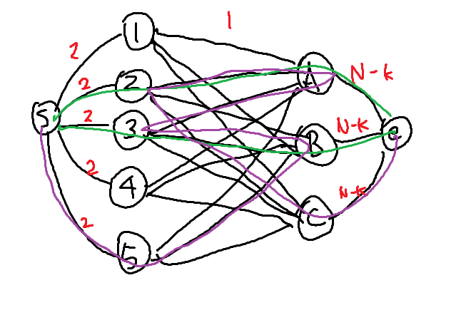 위와 같이 모델링했을 때 조건을 만족하는 배치만 나온다는 사실을 먼저 증명해 보자. $i$번 병사와 $j$번 장군을 잇는 간선에 유량이 흐르는 것은 $i$번 병사가 $j$번 장군에게 소속되지 않을 때라는 것을 명심하자. 일단 각 병사는 최대 $2$만큼의 유량을 보낼 수 있으므로 최소 한 명의 장군에게는 소속될 것이다. 또 각 장군은 최대 $N-K$만큼의 유량을 보낼 수 있으므로, 각 장군에게 소속되지 않은 병사는 최대 $N-K$명이다. 즉, 최소 $K$명은 소속된다는 것이다. 또한, 저 그래프의 최대 유량은 $2N \le 3(N-K)$이므로 $2N$이다. 따라서 각 병사가 무조건 $2$의 유량씩을 보내야 최대 유량이 되고, 각 병사는 정확히 한 명의 장군에게만 소속되게 된다.