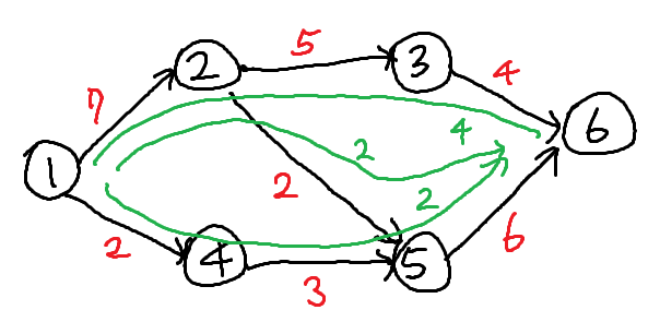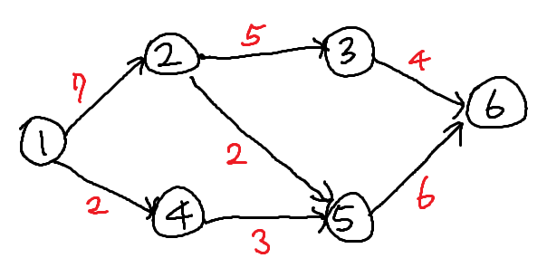 예를 들어, 위와 같은 그래프가 있고, 빨간색 수들이 각 간선의 용량이라고 하자. 시작점(소스 노드)는 $1$번 정점이고, 도착점(싱크 노드)는 6번 정점이다.