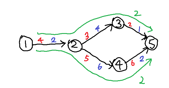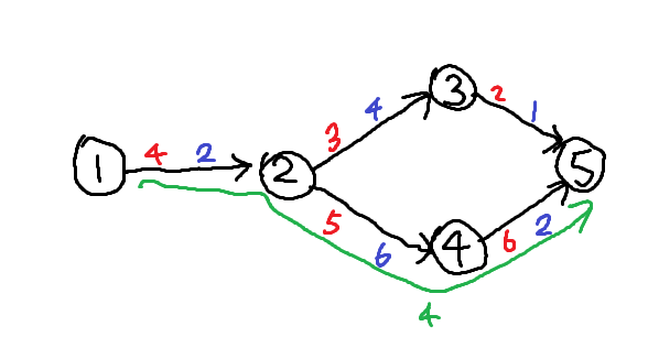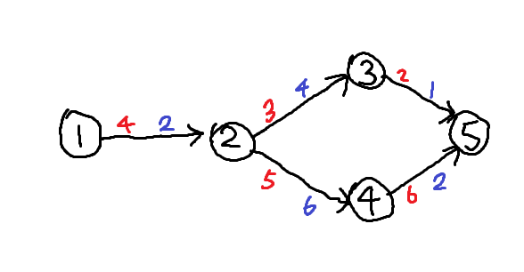 예를 들어, 아래 상황을 보자. 빨간색 수(왼쪽에 있는 수)는 간선의 용량 $c_i$, 파란색 수 (오른쪽에 있는 수)는 비용 $d_i$를 나타낸다.