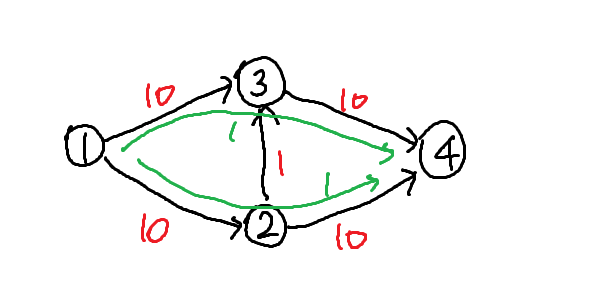 최대 유량은 $4$이다. 그런데 이 유량을 보내는 방법은 여러 가지가 있다. 다음과 같은 경우를 생각해 보자.