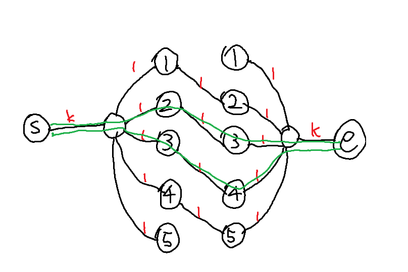 예제에서 $k=2$이고, 이때 MCMF의 해는 아래와 같다.
