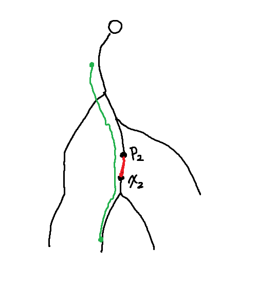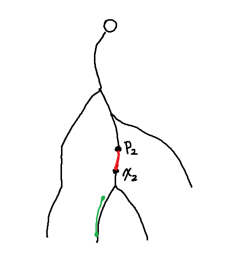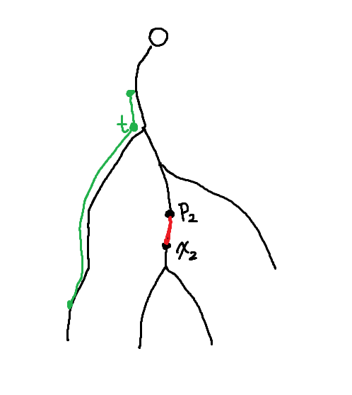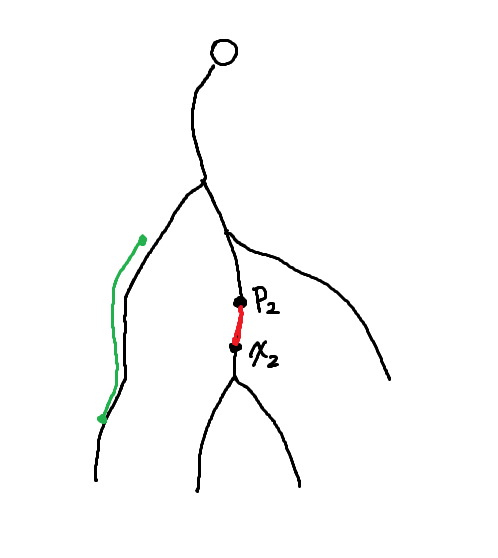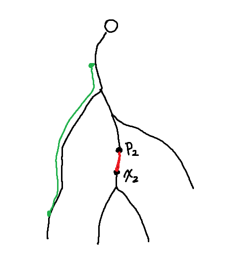 두 간선이 서로 조상 관계인 경우일 때는 생각하기가 조금 더 힘들다. 우리가 선택할 두 간선 중 위에 있는 것을 $e_1$, 아래쪽에 있는 것을 $e_2$라 하고, 각각의 양끝점을 $(x_1, p_1)$, $(x_2, p_2)$라고 하자. 우리는 $x_2$를 고정하고 생각해볼 것이다. 당연히 $p_2$도 자동결정된다.