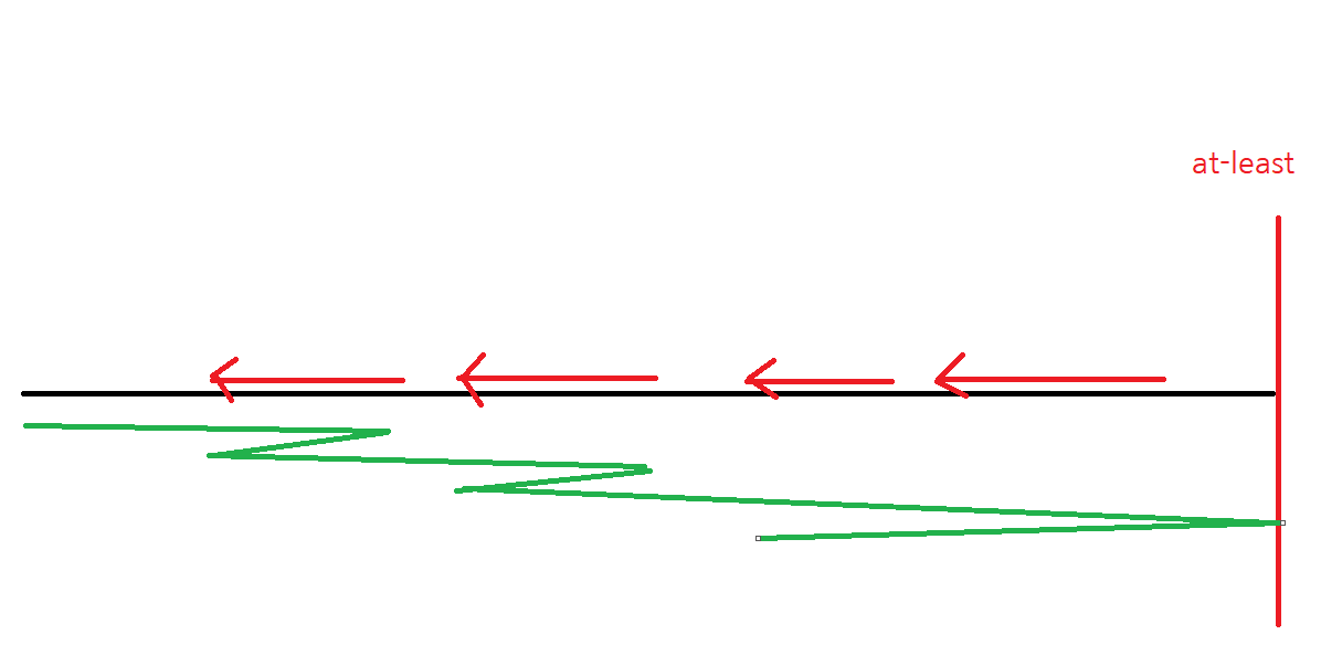 눈치채셨을지도 모르겠지만, $b_i$는 (정의된 $i$에 대해서) $i$번 센서를 나중에 옮겨줘야 하는 위치입니다. 따라서, 기본적으로는 0에서 출발해 $atleast$까지 가되, $a_i$에 있는 센서 몇 개를 $b_i$로 옮겨 주는 상황이 됩니다. 이때 $b_i < a_i$입니다. 여기서 $(a_i, b_i)$ 쌍을 구간 $[b_i, a_i]$로 생각하기로 합시다.
